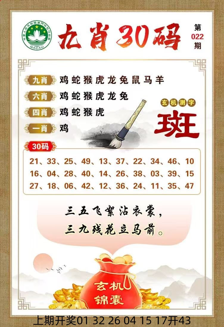 | 021期⑨码 | 30 47 21 28 32 13 22 24 07 | 开:猪43 |